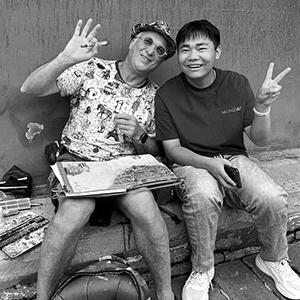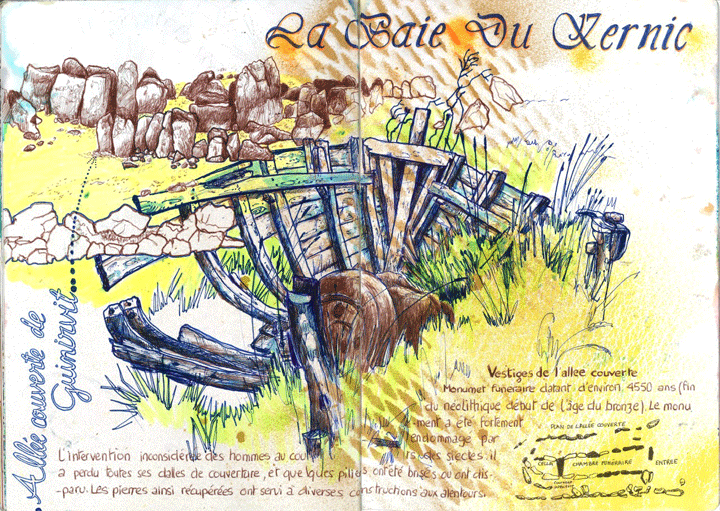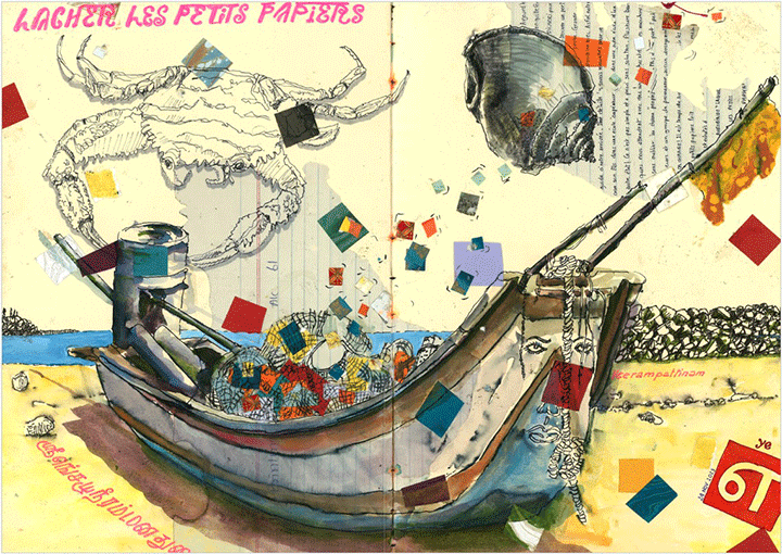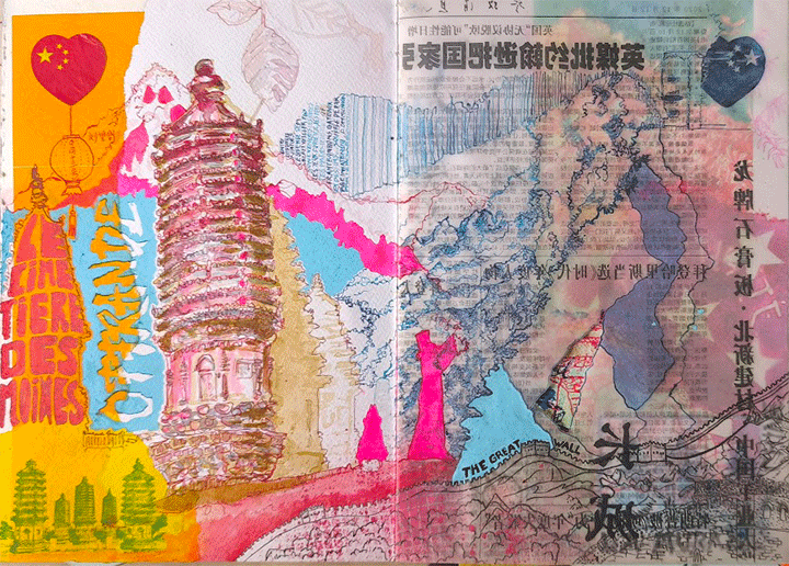 Je savoure ce que le voyage m’offre : la nature, les mouvements de la ville, les curieux, les échanges, les couleurs… et même le contenu des poubelles. Je cherche l’harmonie avec mon carnet et j’y laisse mon empreinte : couleurs fluos arc-en-ciel, textes imbriqués, dessins orientés selon les quatre points cardinaux. Créer sans filet, sans crayon de papier : oser la liberté, explorer, superposer, me surprendre.