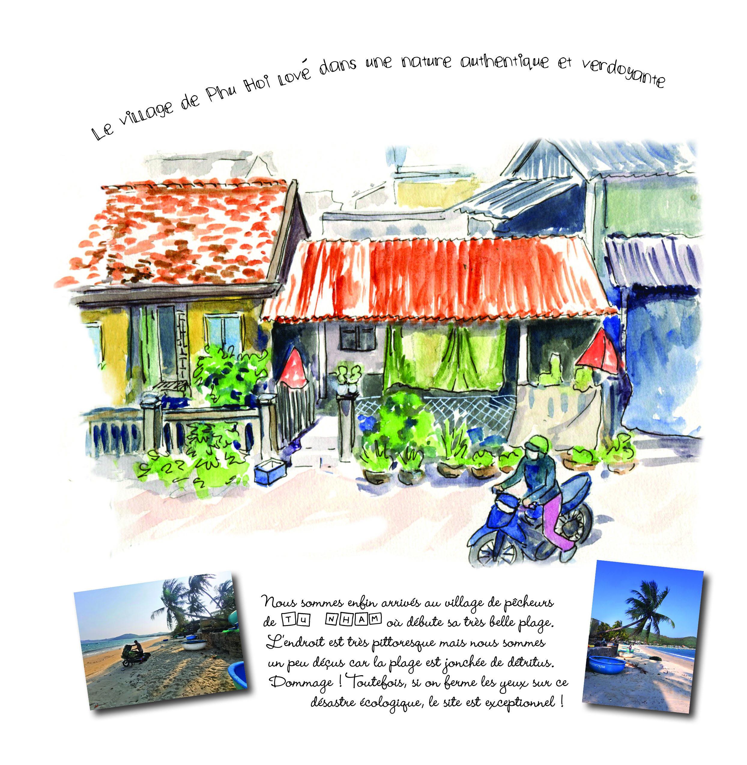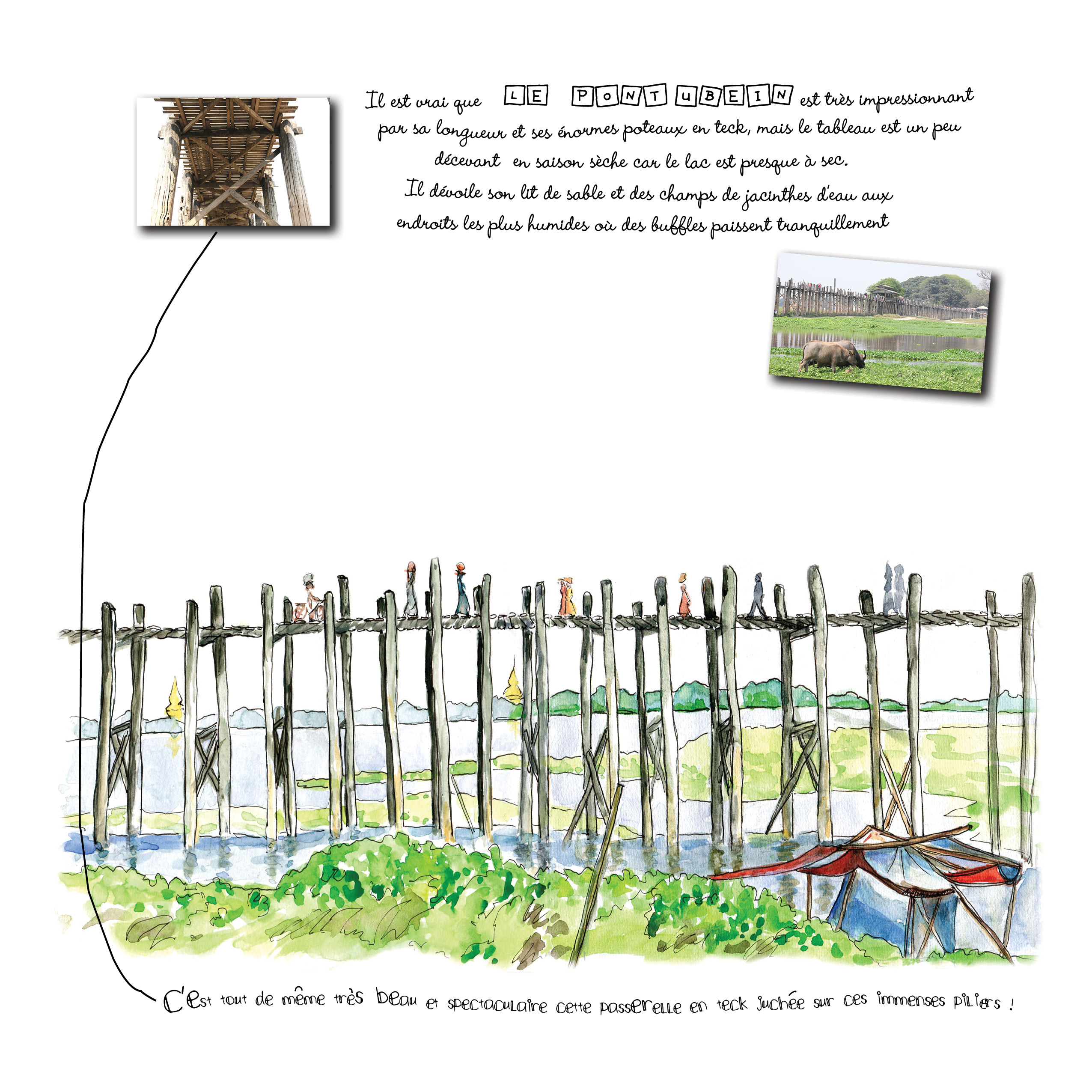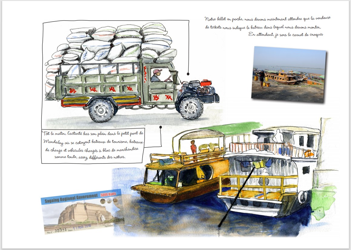 Passionnée de dessin depuis ma plus tendre enfance, l’envie d’illustrer un voyage, m’est venue lorsque j’ai découvert le Laos en 2004. Puis les voyages se sont succédés au Cambodge, au Vietnam et en Birmanie. Je suis devenue une passionnée de l’ Asie du Sud Est. J’affectionne la culture bouddhique et l’extrême bien-être que l’on ressent en voyageant dans ces pays, sans oublier la beauté des paysages très diversifiés, la population restée traditionnelle, gentille et accueillante. Tout cela m’a bouleversée et m’a incitée à raconter mes voyages par le biais du croquis aquarellé et par une description de mes découvertes journalières. Dans mes carnets de voyage on peut découvrir des anecdotes aussi bien sur les moyens de transport, la nourriture, les maisons d’hôtes que sur les endroits visités, les habitudes des autochtones, les paysages, le bouddhisme… Mon vécu dans cette Asie tellement magique. Je dessine in situ sur un carnet A5 accompagné d’une petite boites d’aquarelle. Je le finalise et le met en page pour une impression numérique, une fois rentrée.