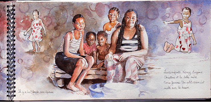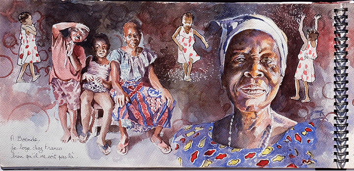 Je fais des carnets de voyage, des aquarelles, des peintures sur toile qui finissent dans des livres ou que j’expose parfois, comme à Kinshasa dernièrement.