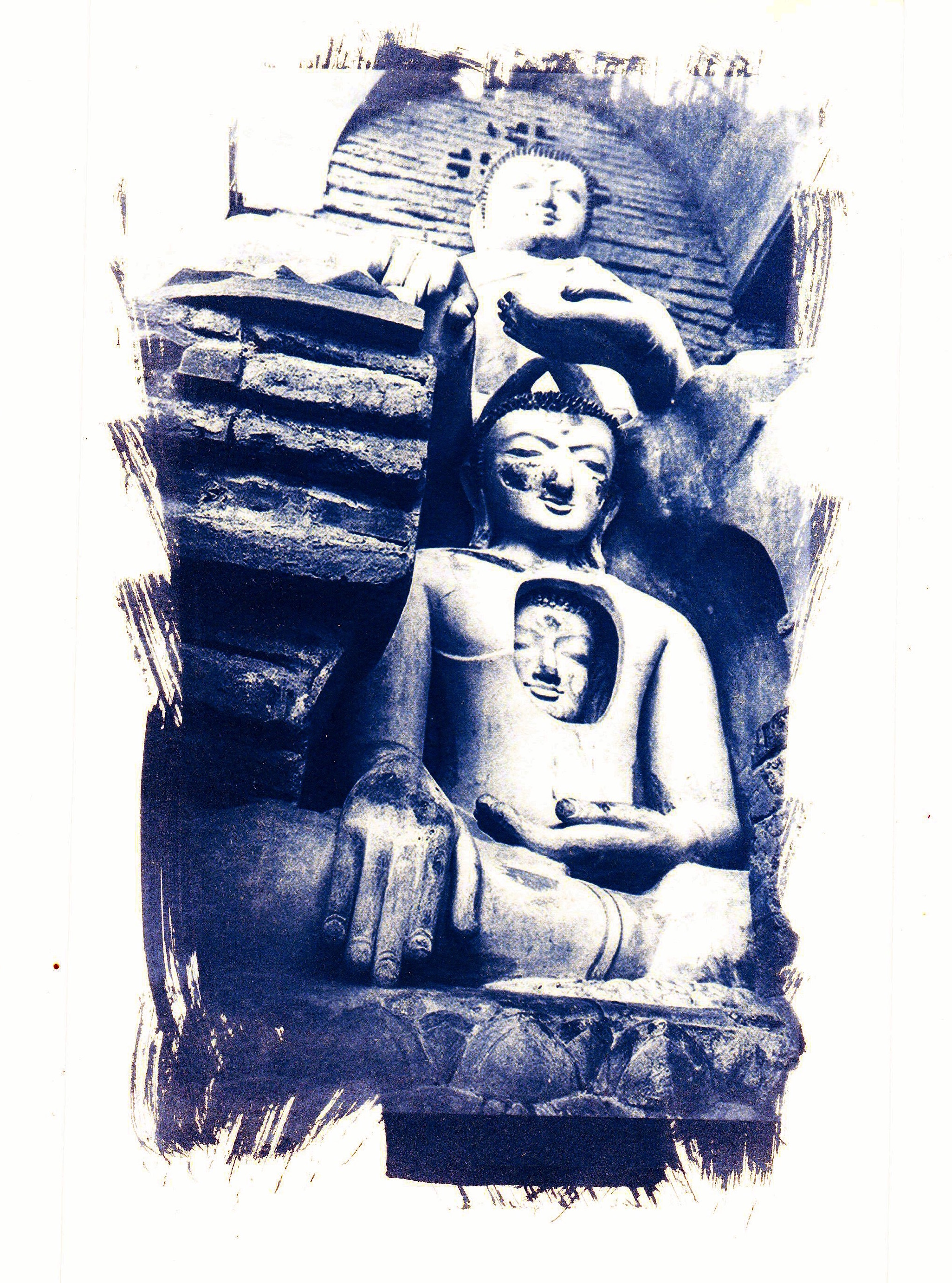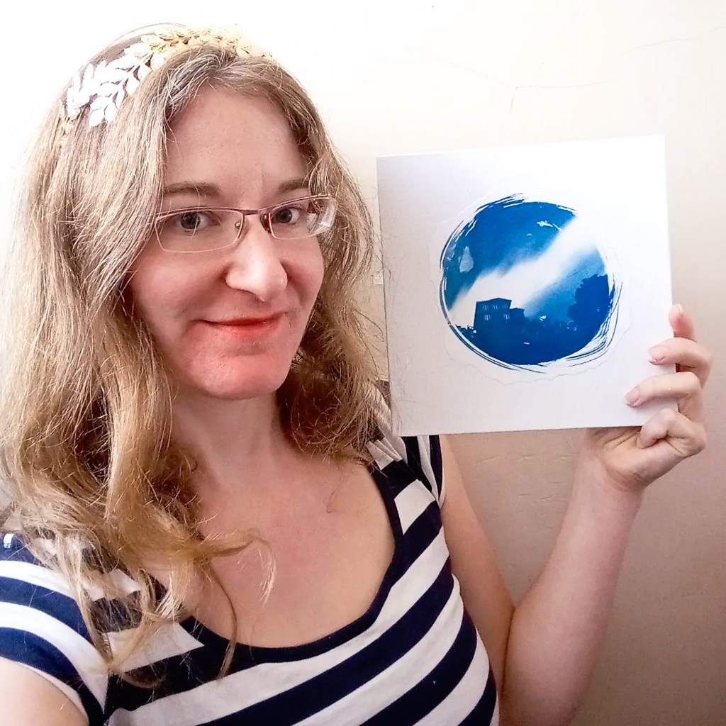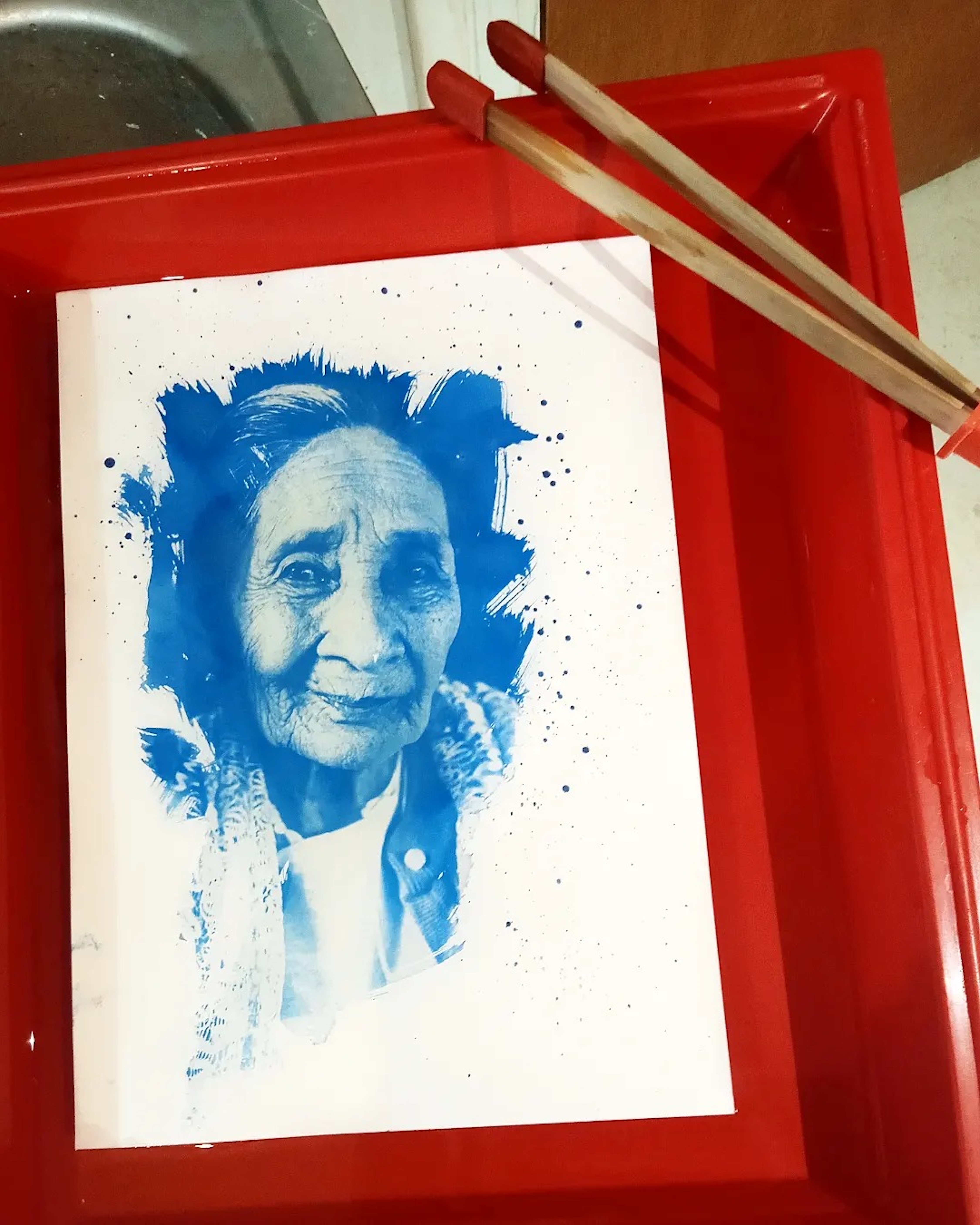 La route la mène ainsi à la photographie documentaire, au portrait, au recueil de témoignages. Plus tard, le besoin de reconnecter avec le toucher dans la création l’emmène vers la peinture sur galets, le carnet de voyage et les techniques mixtes.Le procédé ancien du cyanotype s’y prête bien : à la croisée de la photo et du pinceau, il brouille les pistes du temps avec son bleu de prusse incomparable…