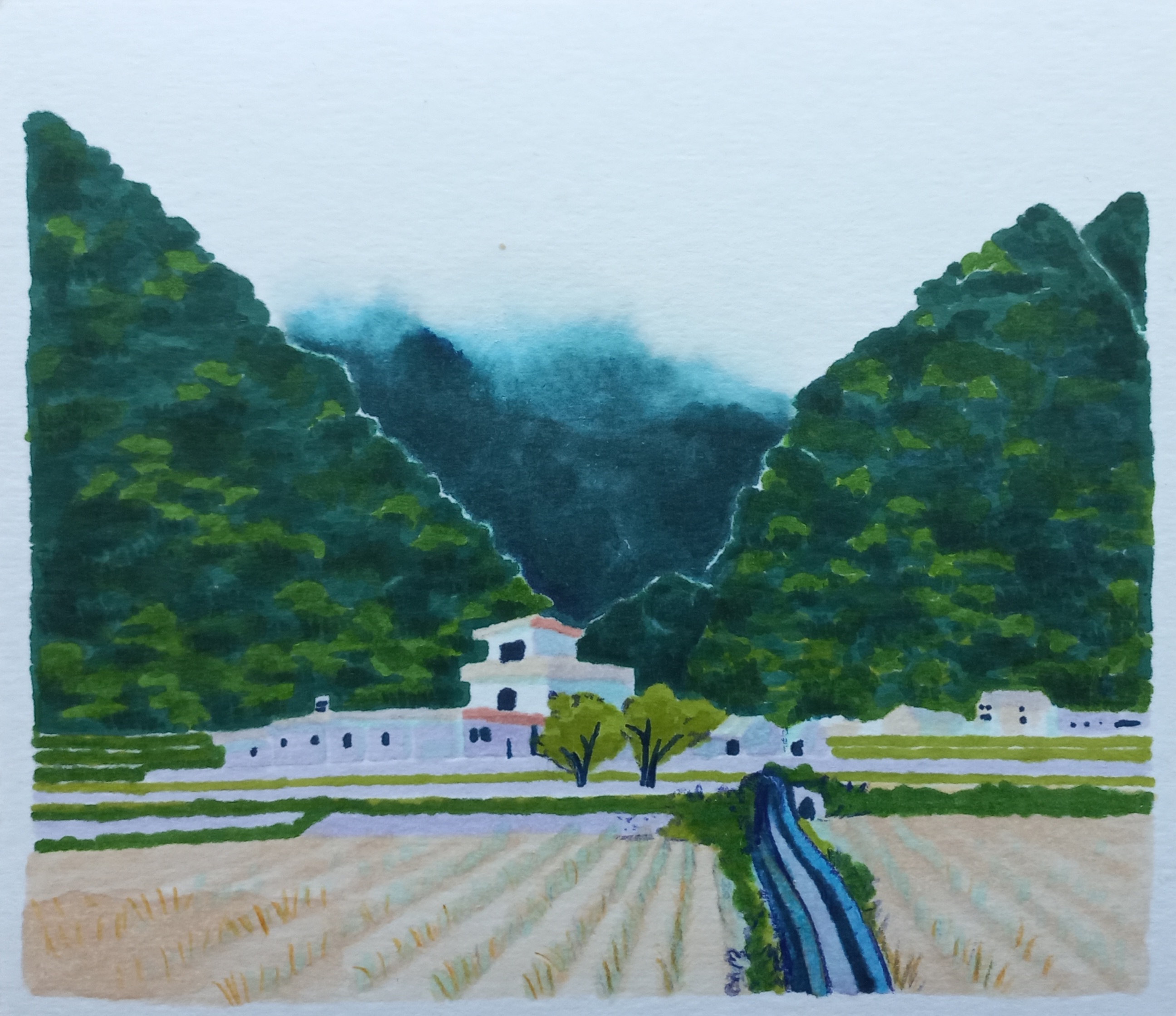 En échange, lors de voyages, le paysage devient sujet d’exploration pour le dessin. Sur les lieux, elle observe, dessine, écrit et surtout se laisse porter par ses émotions. Puis dans l’apaisement de l’atelier, elle redéploie cette matière capturée. Celle-ci se révèle par une première attention portée à la composition puis s’anime par la couleur. La couleur est une échappatoire : elle permet de s’extraire du réel pour inviter à déposer un nouveau regard, pour figer l’impression d’un instant.