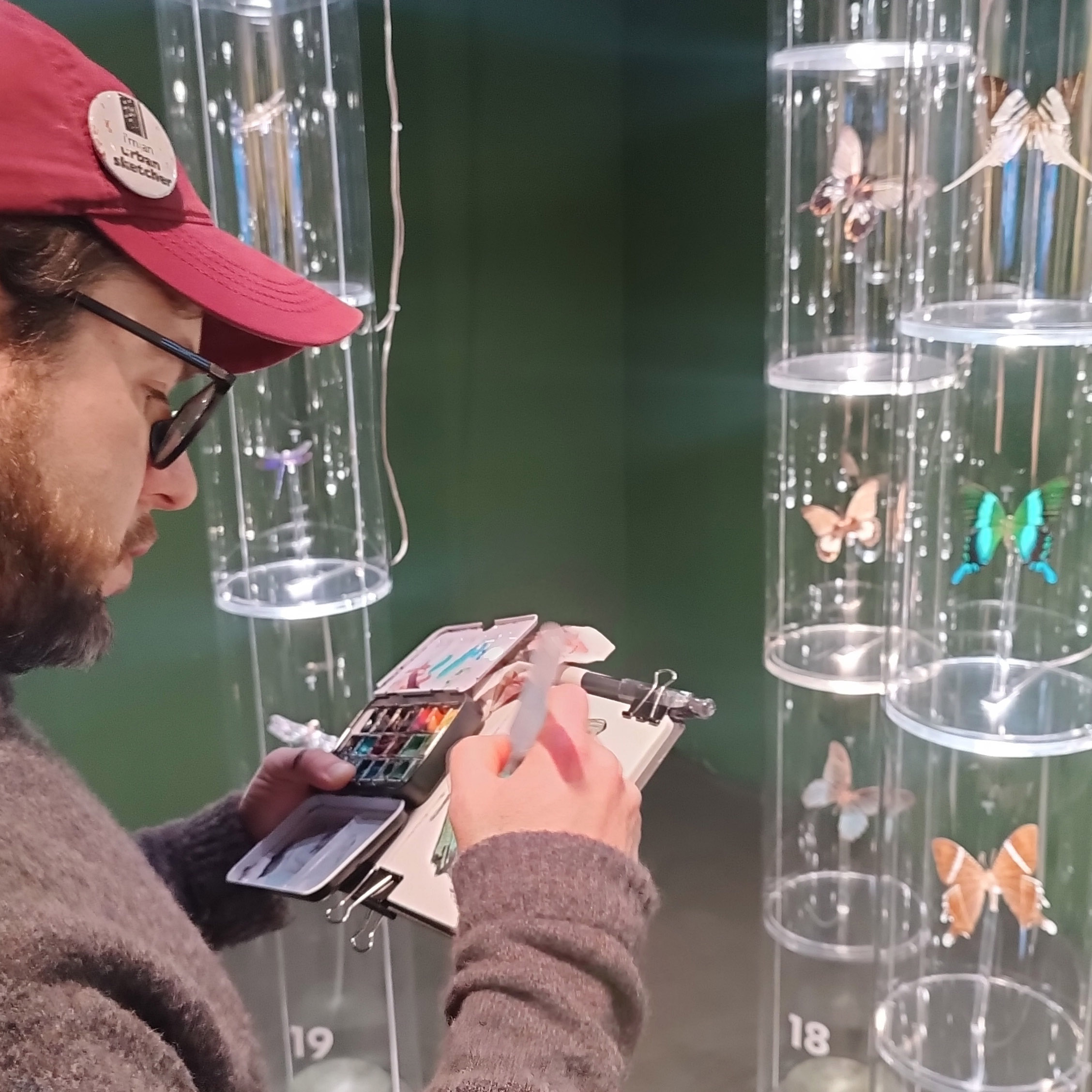 Depuis une dizaine d’années, il est professeur d’art au collège. Sa technique graphique est le dessin à l’encre et à l’aquarelle sur de petits carnets. Ses sujets les plus récurrents sont l’architecture, les véhicules et les détails du paysage.