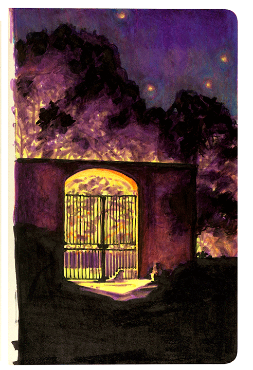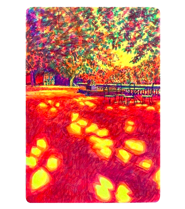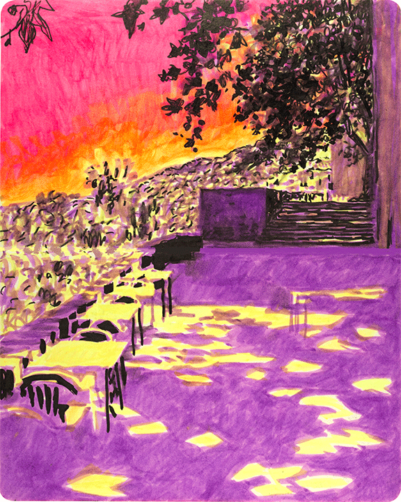 « Tous les moyens sont bons. Les plus rapides. Les plus grossiers surtout. J’ai 50 piges. J’y vois moins clair. Juste assez de lumière. Dessiner flou avec quelques surligneurs de bureau épais aux couleurs franches, c’est ma coquetterie. Quelque part sous le soleil. Partout j’habiterai. Mon jardin comme le Sahara. Et de toutes ces situations, je ferai ma maison. »